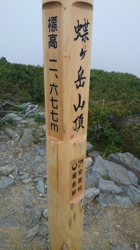 この地点には、蝶槍と蝶ケ岳三角点があるのですが、ガスが濃くて見つけられませんでした。