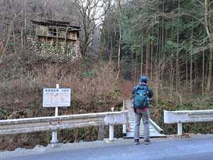 左の写真の看板が目印で、道を渡った所が右の写真で、ここが登山口です。