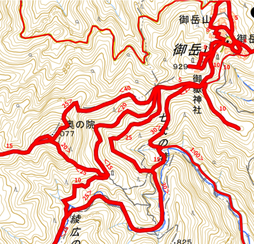 御岳山登山口を入ると、凸凹や段差の多い所を登って行きますが、地図で見ると等高線が狭くて