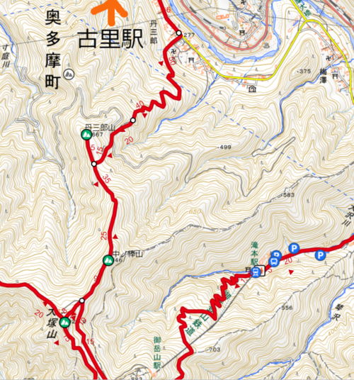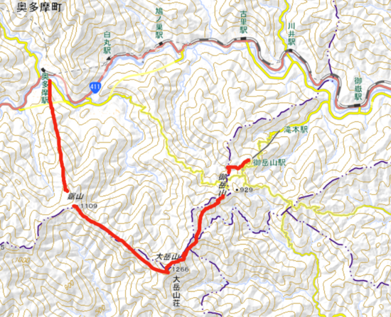 JR青梅線の御嶽駅で降りずに古里駅まで行き、丹三郎尾根を歩いて登る縦走コースです。