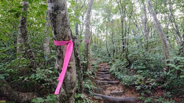 その多くは、ピンク・赤・白い紐が木に付いている、のが登山道の目印です