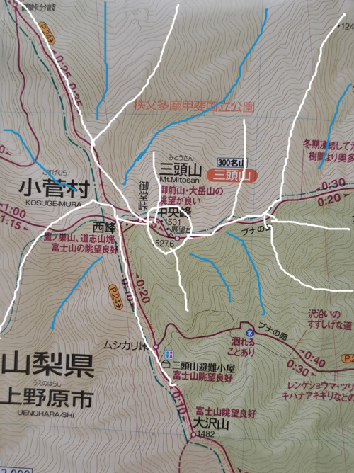 下の画像で、白い線は尾根や高い所で、青い線は谷や低い所です。
