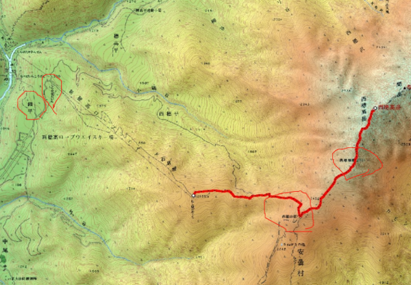 下の地図で、左にある赤〇の所がしらかば平駅と駐車場で、右の赤〇の所が西穂山荘と西穂高独標です
